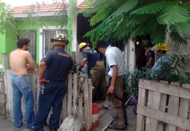 Primeramente quitaron el medidor de la Comisión Federal de Electricidad, para enseguida bajar las mangueras de los carros tanque, y entrar a la casa de material, a sofocar la lumbre.