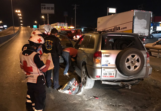 De acuerdo a las versiones que se dijeron en el lugar del percance, la camioneta roja, es decir, la que tripulaba el afectado, circulaba de poniente a oriente sobre el boulevard Manuel Cavazos Lerma, cuando la camioneta gris intenta rebasarlo para subir el puente, pero al no alcanzar éste se impacta contra la base del poste de metal.
