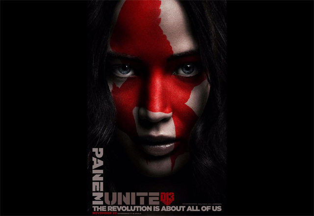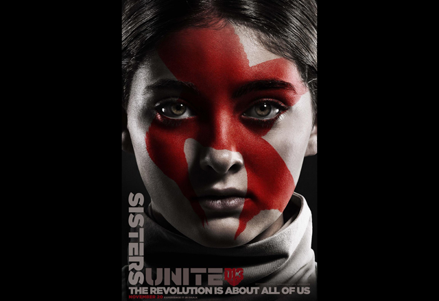 La productora Lionsgate publicó a través de su cuenta de Twitter las imágenes en las que los protagonistas aparecen con un sinsajo rojo pintado en la cara y debajo de ellos la leyenda: “La revolución es sobre todos nosotros”.