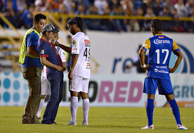 Ya en el inicio del complemento, Ronaldinho hizo que se detuviera el partido al firmarle la camiseta a un aficionado que saltó a la cancha con plumón en mano.