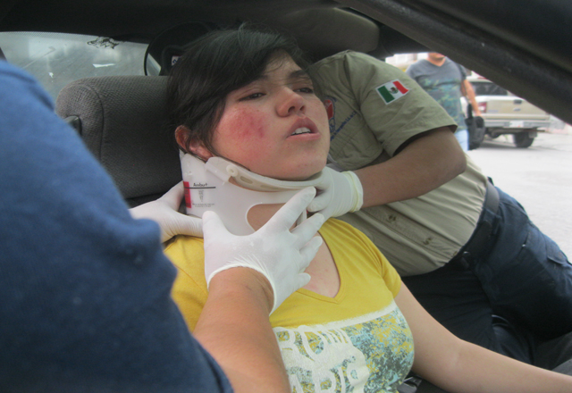24/02/15.-Una jovencita quedó prensada en el automóvil deportivo, en el que viajaba de acompañante, en las calles Calixto de Ayala y Plan de Ayutla, al chocarlo el carro de una cafre que huyó, siendo la víctima sacada del vehículo con el equipo de rescate urbano, a cargo de técnicos en urgencias médicas de Coramedic.