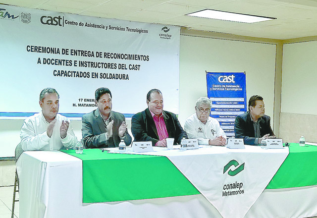 24/01/2017 - El martes 17 de Enero, en el salón de actos del plantel Conalep Matamoros, se llevó a cabo la ceremonia de entrega de reconocimientos por parte del Lic. Agustín De la Huerta Mejía, Director General de Conalep Tamaulipas, a Docentes e Instructores del Centro de Asistencia y Servicios Tecnológicos (CAST Matamoros) que acreditaron el programa de Formación de Instructores (CWE), así como alumnos del Conalep, que participaron en este mismo programa , para el desarrollo de competencia especializados en los procesos de soldadura.