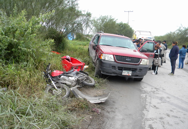 1/12/2015 - Empleado de una cadena de restaurantes de pollo frito ingresó a una clínica particular de la calle Sexta entre Rayón y Victoria con fracturas expuestas en su pierna izquierda y con diversas lesiones en el cuerpo, al ser embestido con la motocicleta que tripulaba, por una jovencita que guiaba una camioneta Explorer en las avenidas San Felipe y Casa Blanca a la entrada del fraccionamiento Infonavit Jardines de San Felipe.