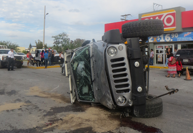25/10/2016 - En grave predicamento está un albañil, ya que en estado de ebriedad, le robó el Jeep Wrangler a un residente de la colonia Acuario 2001, que destruyó en las avenidas 12 de Marzo y Pedro de Alvarado, del fraccionamiento Paseo del Magisterio III, al volcarlo tras de chocar contra dos automóviles, uno de los cuales fue lanzado al canal, estando a punto de irse a las aguas negras, resultando golpeadas una conductora y una menor de edad.