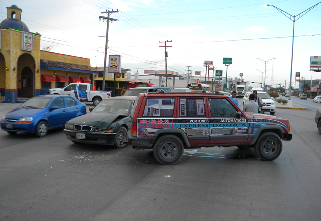 14/10/2015 - Un herrero que acababa de degustar unas exquisitas fajitas provocó que un carro marca BMW le chocara su camioneta al atravesarse en la avenida Pedro Cárdenas Gutiérrez y 10 de Abril frente a la colonia Las Granjas, tras salir sin precaución de un conocido restaurante.