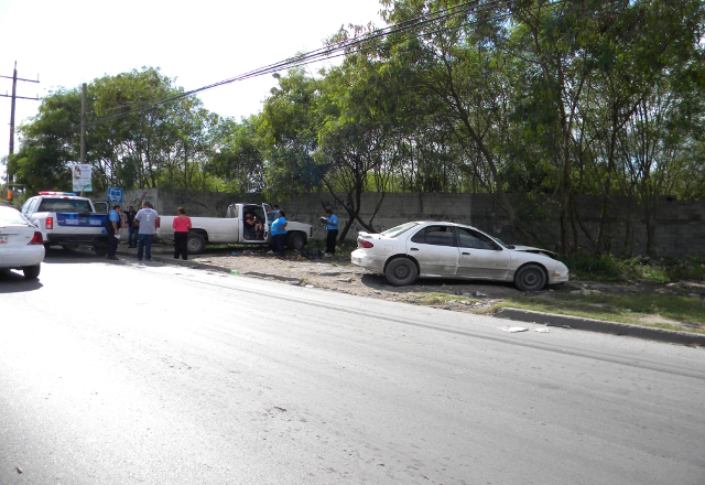 A la escena del choque entre un automóvil marca Pontiac Sunfire, modelo 2000, color blanco, de cuatro puertas, y una camioneta pick up marca GMC, modelo 1998, color blanco, llegaron técnicos en urgencias médicas de Protección Civil, así como patrulleros y un perito de la Policía Vial.
