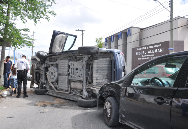 14/10/2016 - Por andar rebasando, una mujer que radica en la colonia San Francisco ocasionó un choque volcadura en las calles 12 y Río Bravo, pues su imprudencia al manejar le sacó el susto de su vida al volcar su minivan tras chocar contra un auto y parte de un poste.