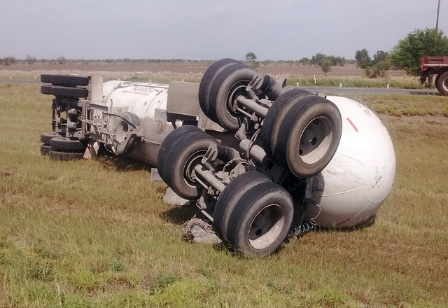 Al decir del chofer, Ramón Olivo Hernández, de la ciudad de Reynosa, venía a la empresa Tergas de esta población fronteriza a reabastecer las dos cisternas de gas, cuando en el kilómetro 29 perdió el control del vehículo, desprendiéndose el segundo remolque, quedando volcado en la cuneta, mientras que él con el tráiler y el primer tanque se volcaba en la cinta asfáltica, quedando invadiendo medio carril.