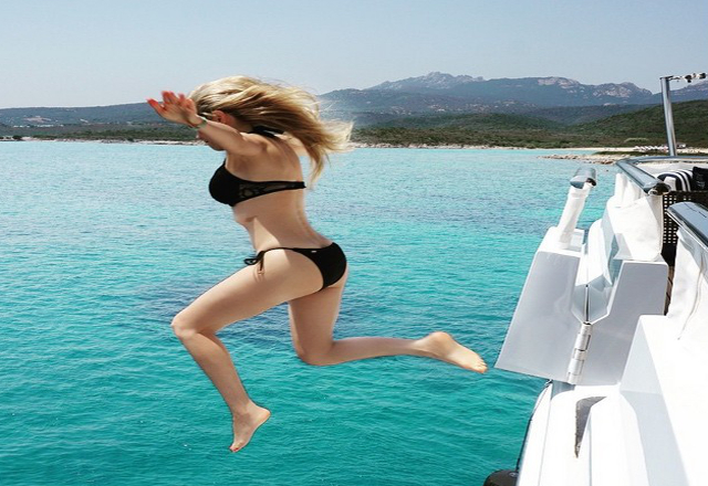 En una de las imágenes aparece a bordo de un yate, pensando en saltar o no al mar, mientras que en otras se le ve en pleno salto y en una más se le ve acercándose a su hijo.