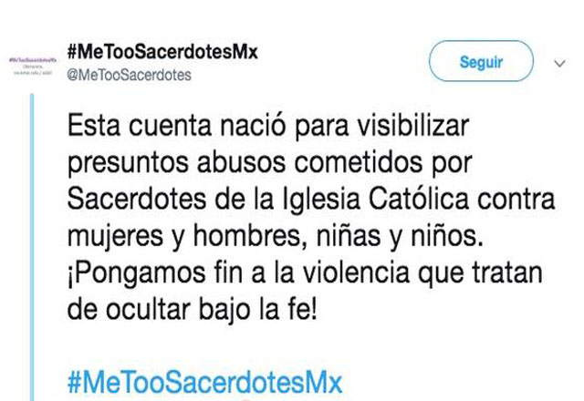 Con el usuario @MeTooSacerdotes, la cuenta indica en su información que busca señalar a presuntos depredadores y agresores de la Iglesia católica en México.