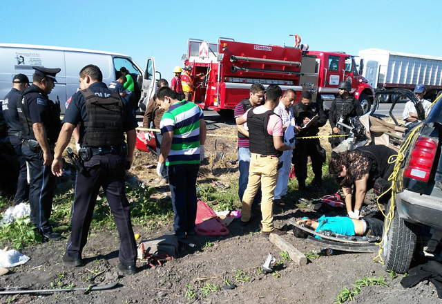 2/02/2016 - Un tráiler que transitaba de norte a sur por el libramiento Francisco Villa, ocasiona un choque múltiple, luego de salirse del camino y reincorporarse a la cinta asfáltica, llevándose de encuentro a dos camionetas que circulaban en sentido contrario; el saldo sangriento fue de cuatro muertos y una lesionada que se encuentra recibiendo atención médica en el Hospital General de San Fernando.