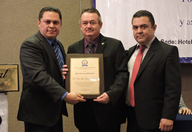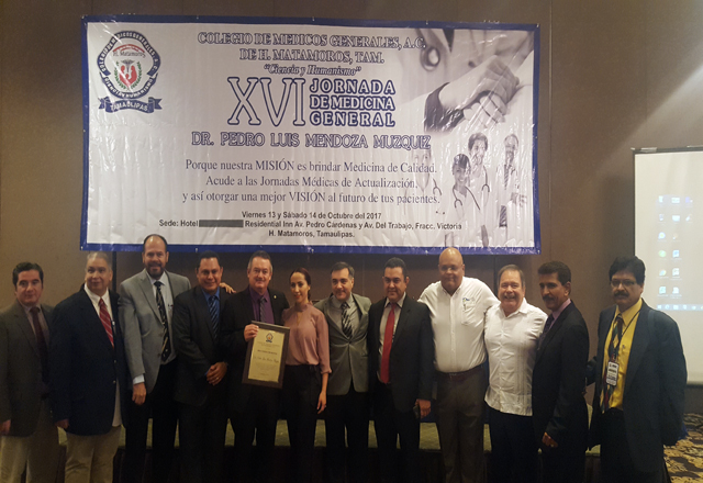 28/10/2017 - De manera exitosa el Colegio de Médicos Generales, A.C., de H. Matamoros, Tam., que preside el Dr. Alfredo Becho Del Fierro, llevó a cabo su XVI Jornada de Medicina General, la cual tuvo lugar los pasados días 13 y 14 del mes en curso en el Hotel Residencial. El homenajeado en esta ocasión fue el Dr. Pedro Luis Mendoza Múzquiz, por lo que después de las palabras de bienvenida del presidente del colegio, se dio lectura al amplio currículum que le acredita profesionalmente y se le hizo entrega de un reconocimiento, por lo que ocupó la tribuna para agradecer la deferencia que le hicieron, con este homenaje.